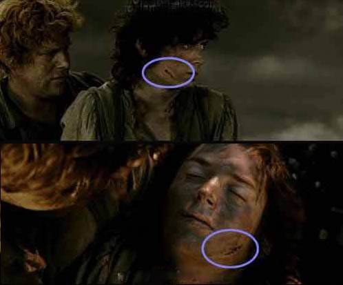 Oyuncunun yüzündeki yara ilk önce sağda iken sonra solda görülüyor.
